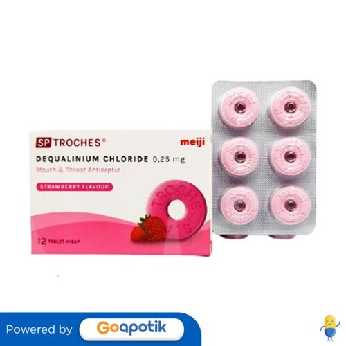 Deskripsi: SP troches digunakan untuk meredakan nyeri tenggorokan, infeksi rongga mulut dan faring, setelah ekstraksi gigi untuk mencegah infeksi membran mukosa mulut dan mencegah batuk dan pilek, terutama untuk perokok dengan rasa melon. | Komposisi: Tiap tablet mengandung dequalinium chloride 0,25 mg | Dosis: 1 lozenges (tablet hisap) di atas lidah, ulangi tiap 3-4 jam. Maksimal 8 tablet per hari | Indikasi: Digunakan untuk meredakan nyeri tenggorokan, infeksi rongga mulut dan faring, setelah ekstraksi gigi untuk mencegah infeksi membran mukosa mulut dan mencegah batuk dan pilek, terutama untuk perokok | Perhatian Khusus: Belum ada data peringatan | Kemasan: 1 strip @ 6 tablet | NIE: DBL9415301812A1