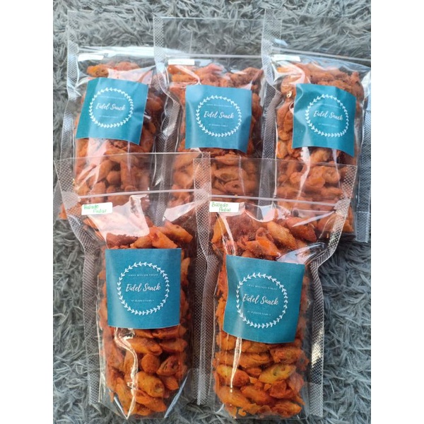 Cemilan yang empuk dan renyah. Gurih dengan sensasi daun jeruk. Isi 100gr rasa balado pedas.