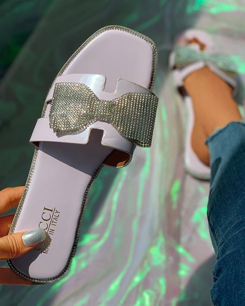 Square Toe Bowknot Pattern Rhinestone Flat Sliders, Light purple