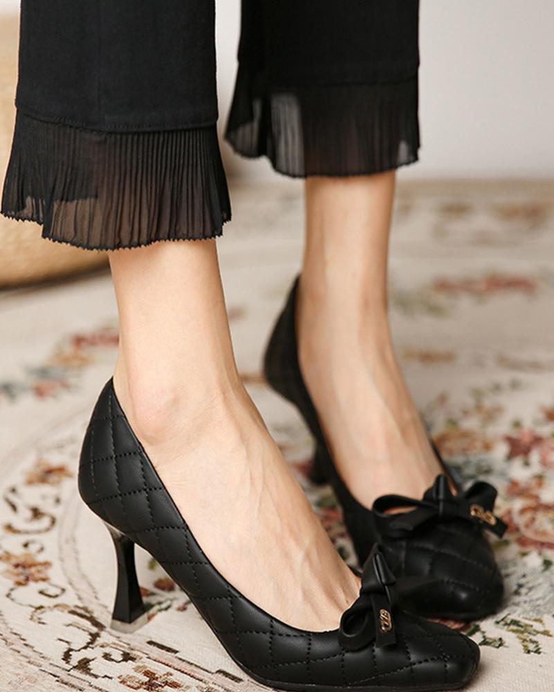 Square-toe Solid Color Splicing Bow High Heels, Black