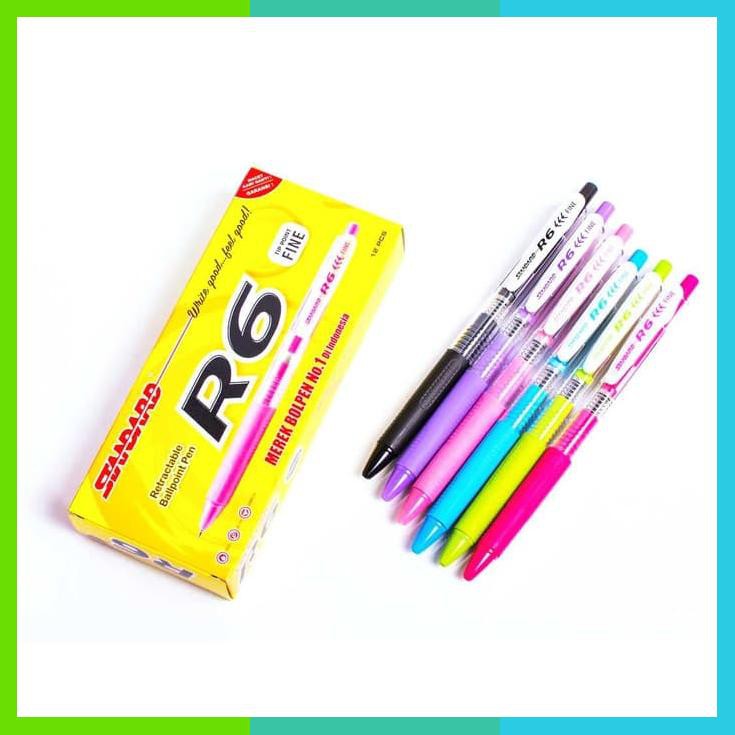 Pulpen Standard R6 yang berbentuk Retractable Ballpoint Pen dengan Fitur Auto Retract membuat konsumen merasa lebih aman tidak perlu khawatir noda tinta akan terkena kantong kemeja dan dengan Rubber grip yang membuat menulis menjadi lebih Nyaman. Hadir dengan berbagai varian warna body : Pink, Light Pink, Light Blue, Light Purple, Green, Black / Mix Color dalam 1 box dengan Tinta Warna Hitam (Oil Gel) dan Tinta Warna Biru, Body-nya juga Biru / Tidak Warna Warni.