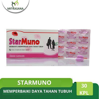 DetailsStarmuno merupakan suplemen yang baik untuk membantu memperbaiki daya tahan tubuh. Spesifikasi:1. Isi 30 @ 3 Strip2. Bentuk kaplet Komposisi:1. Polinacea 200 mg2. Black Elderberry 400 mg3. Zinc Picolinate 5 mg4. Vitamin C 100 mg Dosis pemberian:- Dewasa dan anak >12 thn = 3x1 kaplet perhari- Pencegahan = 2x1 kaplet perhari