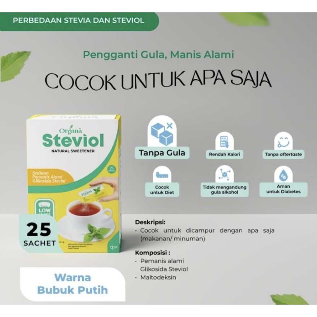 Organa Steviol Natural Sweetener dikemas dengan aluminium foil sehingga kualitasnya lebih terjamin, lebih higienis, dan rasa lebih terjaga.