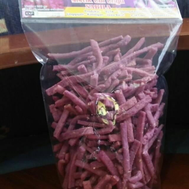 Stick ubi ungu,rasa nya ada gurih ada manis karna dari rasa ubi nya,cocok untuk makanan ringan dan acara lain nya.asli dari linggarjati-kuningan#