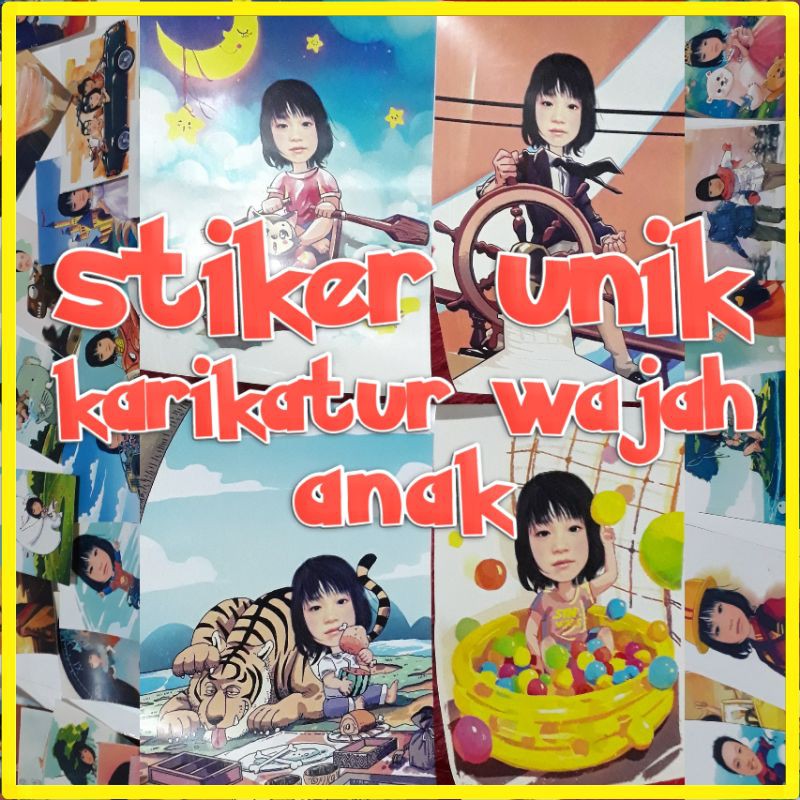 Stiker karikatur lucu dengan customisasi wajah, terdapat banyak tema, cocok utk anak laki2 maupun perempuan.