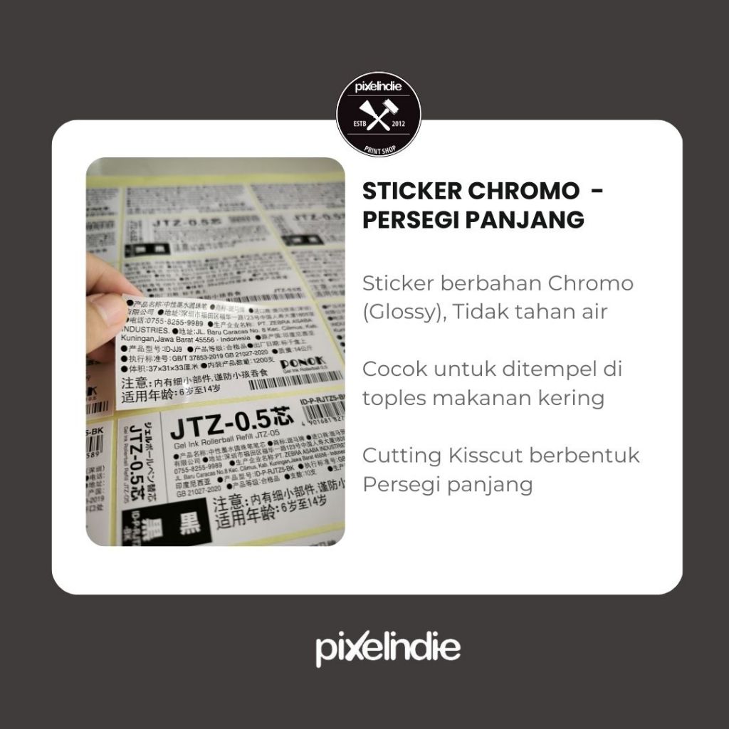 Sticker chromo merupakan sticker yang masih mengandung plastik licin. Bisa dipakai sebagai label kemasan brand, dan kemasan makanan kering.