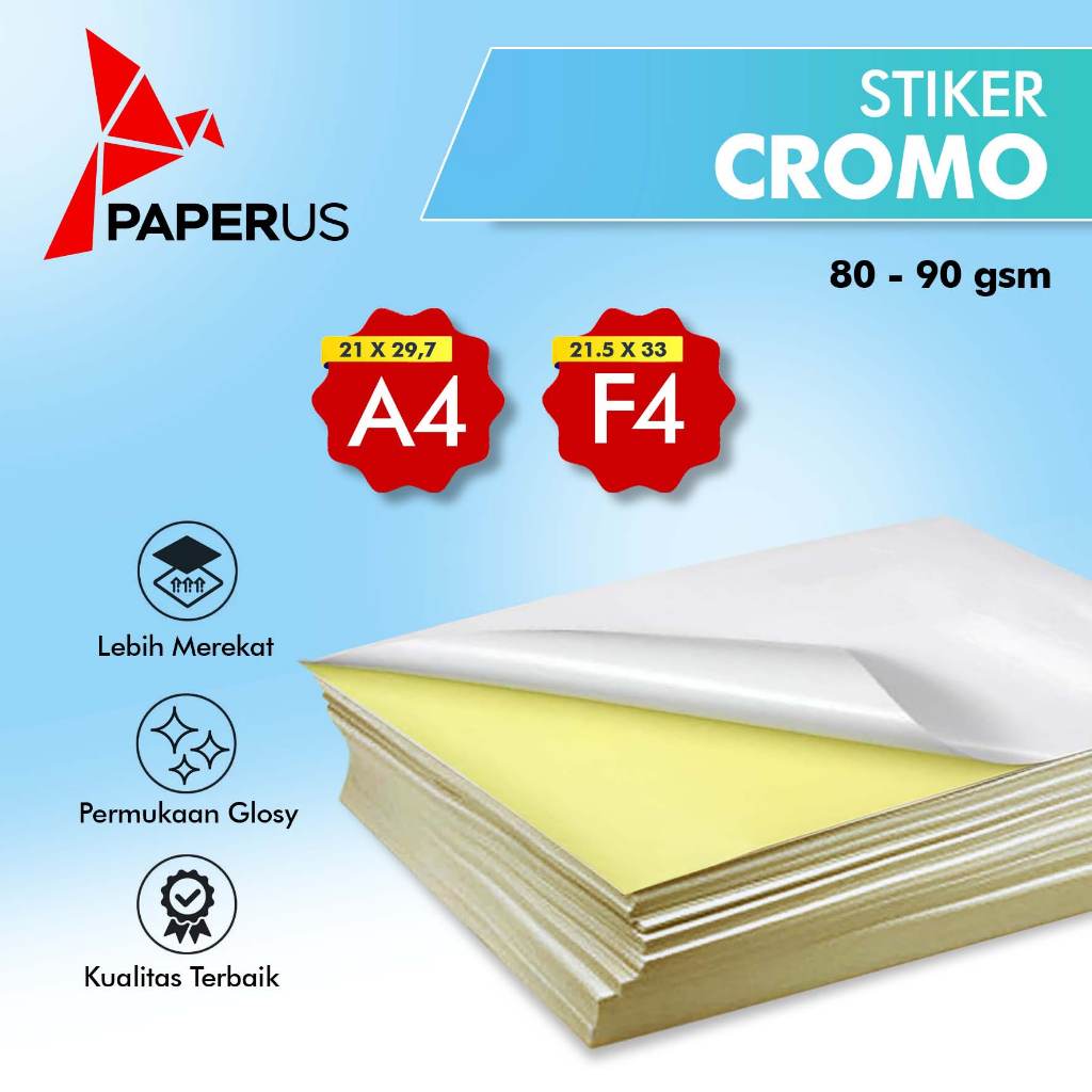 Stiker cromo adalah jenis stiker yang terbuat dari kertas dengan lapisan glossy, yang membuatnya terlihat mengkilat dan licin. Stiker cromo dikenal dengan harga yang terjangkau dan cocok untuk aplikasi di dalam ruangan, seperti label botol, promosi, atau label kemasan makanan kering. Namun, stiker cromo tidak tahan air dan mudah rusak jika terpapar air atau gesekan.