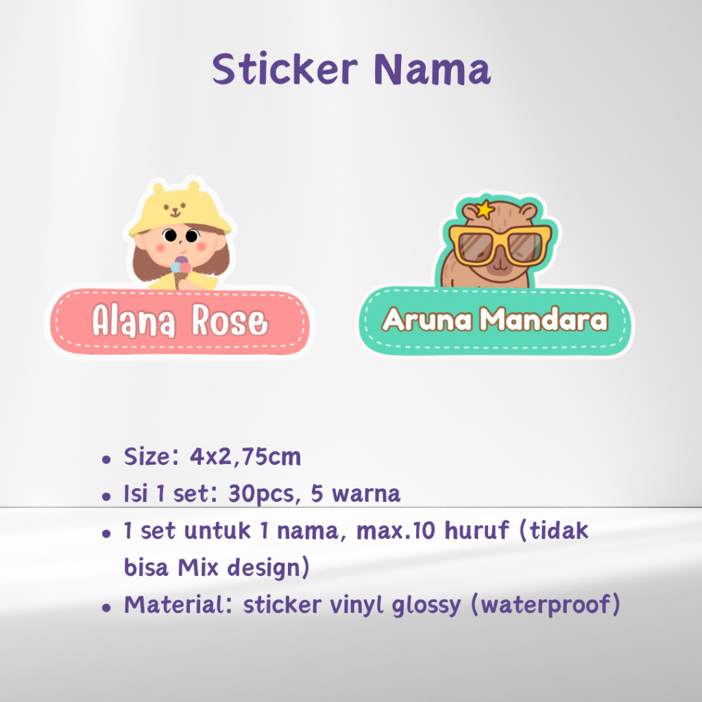 Sticker nama anak dengan design yang cute, bisa ditempel di barang-barang anak agar tidak tertukar di sekolah.