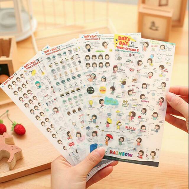 Sticker Day&Day ini 1 set berisi 6 lembar, motif lucu-lucu, isi banyak. Bisa kamu gunakan untuk menghias gelas, diari, HP, buku, dan sebagainya.