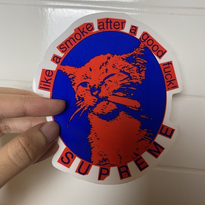 The sticker features a cat smoking a cigarette and the words "Like a smoke after a good f!" on it.
