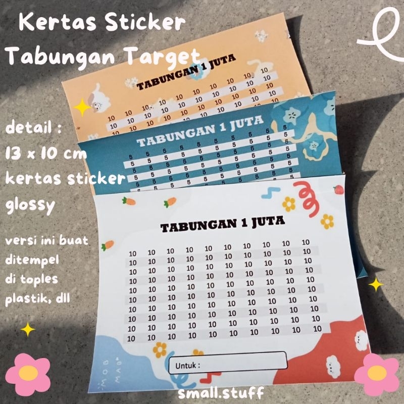 Hai, small.stuff punya produk sticker yang bisa kamu tempel di meja, dinding, zipper bag, kotak penyimpanan, dan lain-lain untuk mempermudah kamu nabung. Harganya murah kok, banyak pilihan target/pecahan, dan background. Tap target/pecahan yang kecil-kecil aja ya, biar cepat selesai Dan pastinya muat
