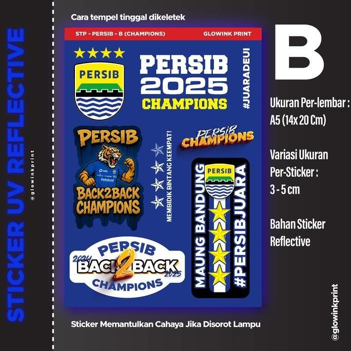 Bahannya pakai Sticker Reflective yang bisa mantulin cahaya, Diprint dengan Printer UV yang berkualitas dan awet. Hasil timbul Varnish Glossy yang unik bikin tampilan sticker jadi beda dari yang lain. Cocok ditempel di kendaraan atau barang kesayangan, dan yang pasti cocok buat dibawa nobar Maung Bandung sampai Juara!