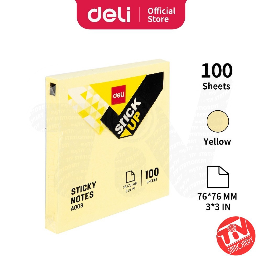 Stick Notes merek Deli warna kuning ukuran standar (76x76 mm). Harga tertera merupakan harga per pack yang berisi 100 lembar.