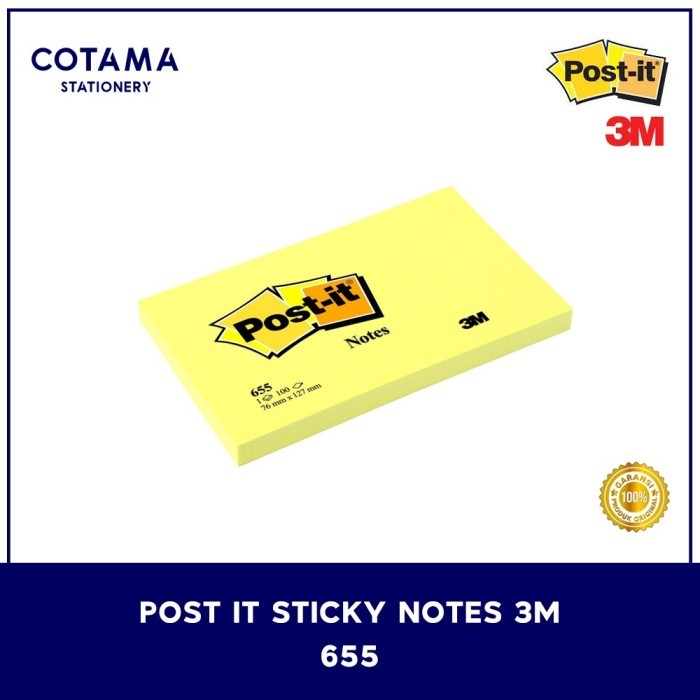 Post It 655 merupakan post it berkualitas tinggi dengan bahan yang sangat bagus. Dengan warna yang cerah serta kualitas tinggi, banyak yang senang menggunakan post it ini karena dapat menempel dengan kuat namun tidak lengket ketika dilepas.
