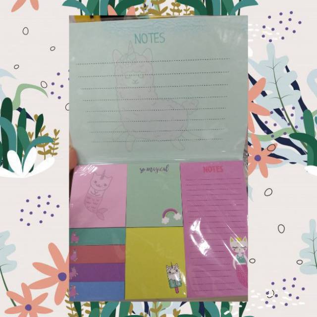 Sticky Notes set ini terdiri dari berbagai motif dan ukuran dalam satu produk. Bentuknya seperti buku.