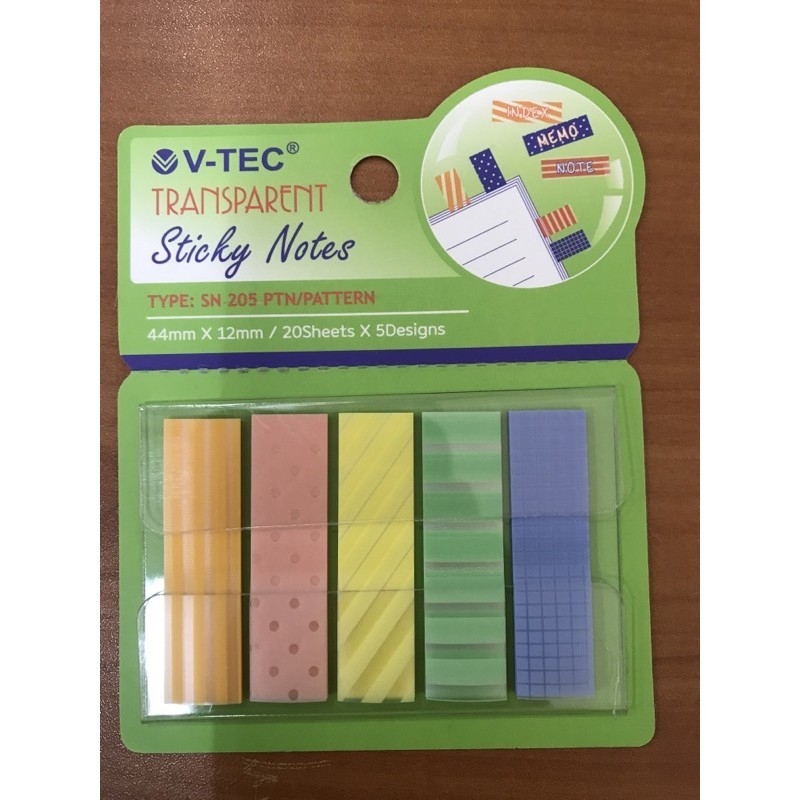 Merk : V-Tec Type : SN 205 Pattern Ukuran : 44 X 12 mm Berat 1 set : 10 gram (ditambah kemasan) Isi 1 set: 100lembar (Mix 5 design warna @ 20 lembar per design) Bahan : Plastik PET (Transparant) Tidak membekas dikertas.