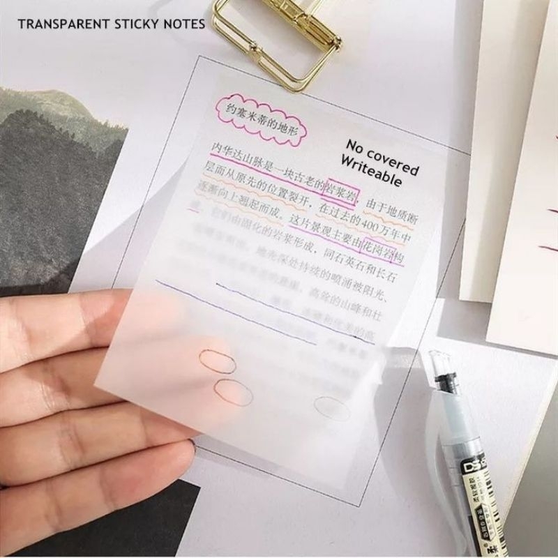 Sorot informasi penting dalam buku dengan pena dan kertas kalkir tempel tanpa menulis langsung di buku.