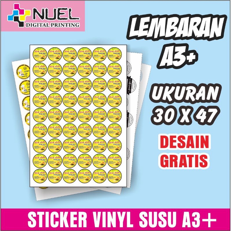 Stiker label untuk kemasan produk, bahan stiker ada yang dari kertas dan ada yang dari plastik anti air. Finishing stiker bisa di cutting sesuai pola gambar atau bisa lembaran saja. Untuk info lebih lanjut bisa request nomer Whatsapp melalui chat di shoppee.