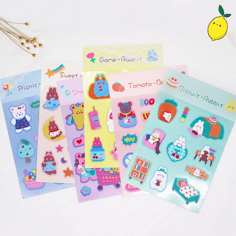 Kelinci dan beruang dalam warna-warni yang semarak ini hadir menghiasi halaman diarimu. Kumpulan stiker kartun dengan tema yang bervariasi ini dapat ditempel di berbagai permukaan, bahkan yang sering terkena air sekalipun.