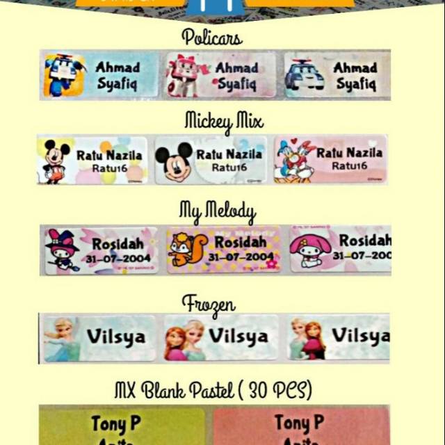 Stiker nama anti air. Tersedia berbagai pilihan karakter lucu2. Tidak luntur oleh air.