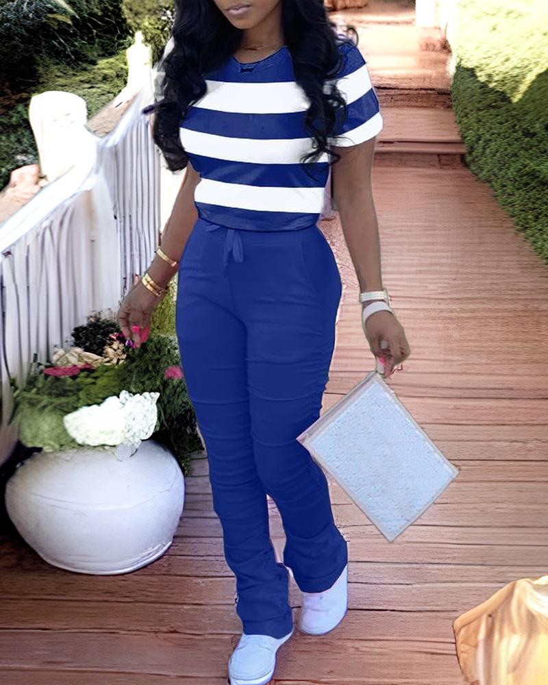 Striped Colorblock Top & Drawstring Ruched Pants Set, Blue