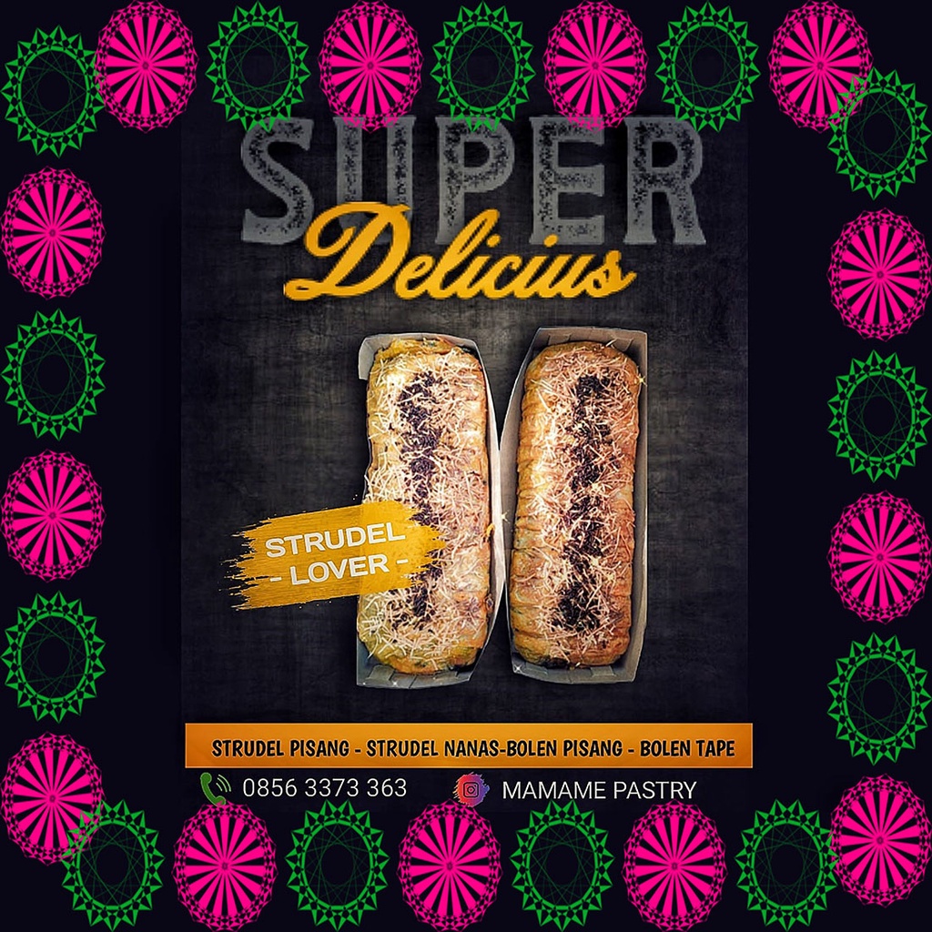 - STRUDEL BANANA : Isi pisang coklat keju, berbalut kulit pastry yang renyah dengan topping parutan keju dan messes coklat