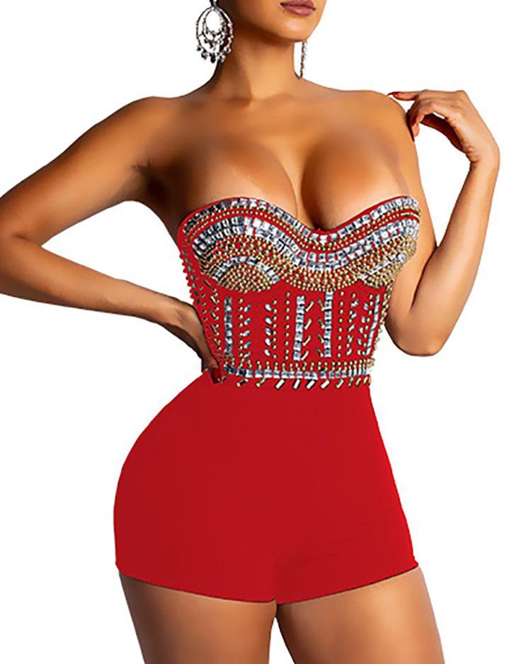 Studded Rhinestone Patch Bandeau Backless Romper, Red