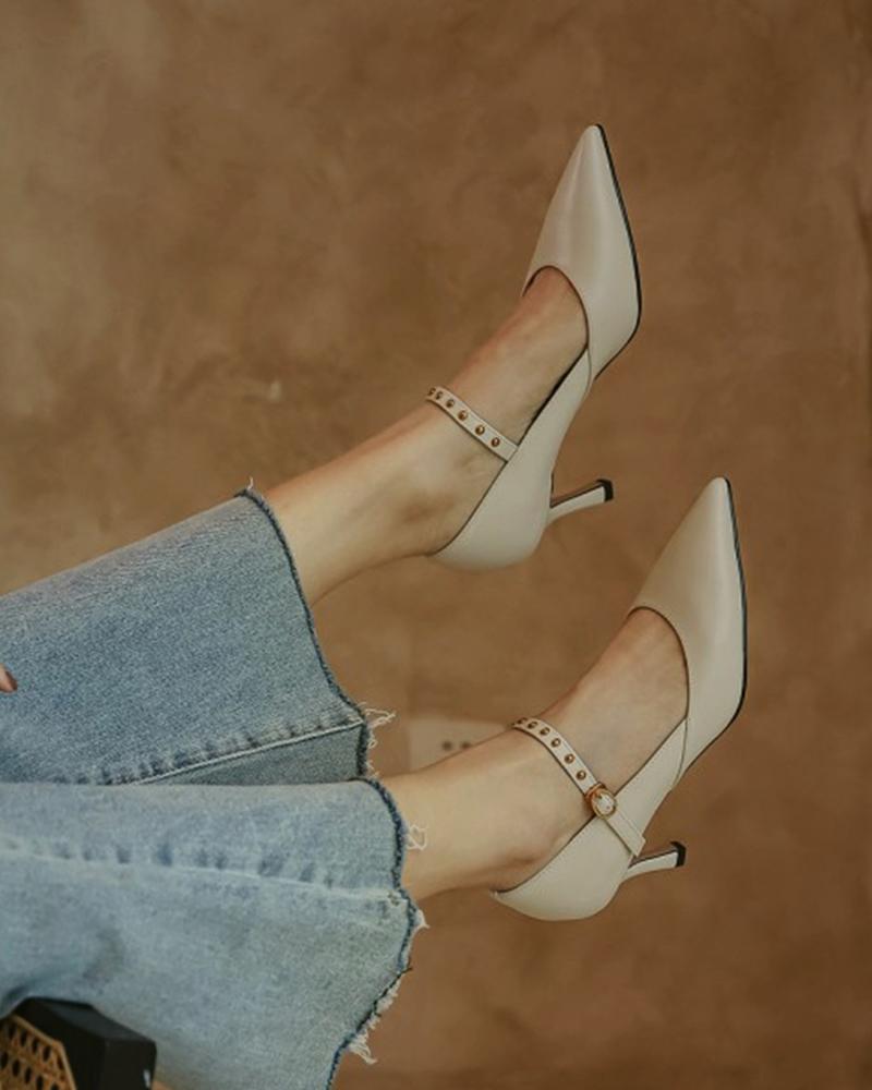 Studded Strap Pointed Toe High Heels, Beige