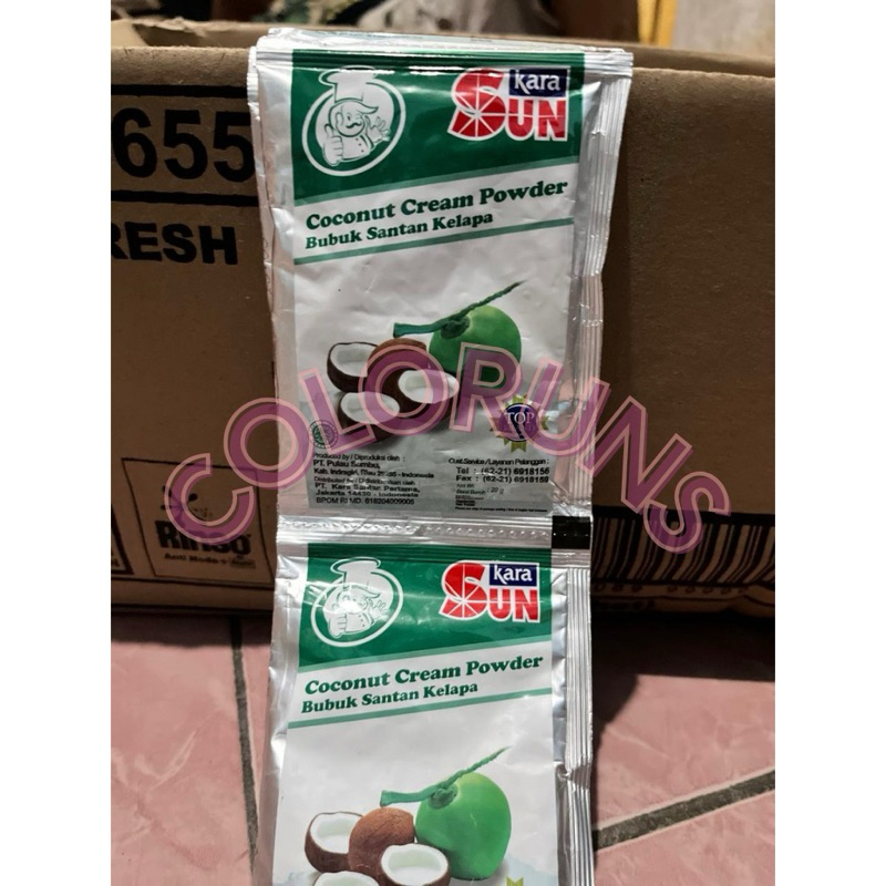 Kara Sun Coconut Cream Powder merupakan santan kelapa siap pakai yang terbuat dari kelapa pilihan. Santan Kara Sun diolah dan dikemas secara modern dan higienis menggunakan teknologi modern sehingga kesegaran dan keaslian santan terjaga dengan baik, serta membuatnya tahan disimpan dalam waktu lama di dalam kulkas. Mengandung lemak nabati kurang lebih 25%, juga dibuat tanpa pengawet sehingga aman digunakan.
