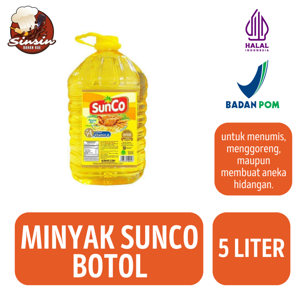 SunCo adalah minyak goreng sawit berkualitas yang diproses dengan teknologi modern sehingga jernih, higienis, dan tidak mudah tengik. Dikemas dalam ukuran ekonomis 5 liter, cocok untuk kebutuhan rumah tangga besar, usaha kuliner, restoran, maupun katering.