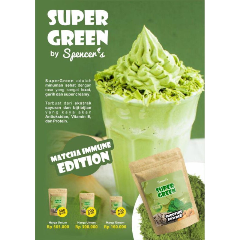 SuperGreen by Spencer’s Indonesia adalah minuman sehat dengan rasa yang sangat lezat, gurih dan super creamy. Terbuat dari ekstrak sayuran dan biji-bijian yg kaya akan Antioksidan, Vitamin E, dan Protein.