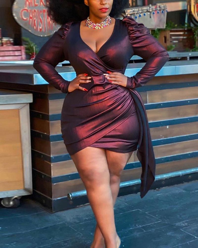 Surplice Neck Puff Sleeve Ruffles Detail Ruched Bodycon Dress, Red