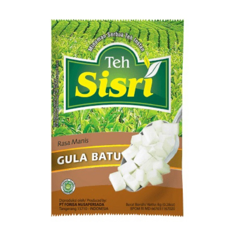 Teh Sisri Dari Forisa merupakan salah satu produk teh dalam bentuk bubuk instan yang praktis. Teh Sisri sudah dilengkapi dengan gula, sehingga tidak membutuhkan penambahan gula. Minuman ini menyegarkan, juga memiliki aroma yang khas. Produk ini terbuat dari bahan alami yang berkualitas. Dijual per renceng isi 10 bungkus bernetto 8 gr per bungkusnya.