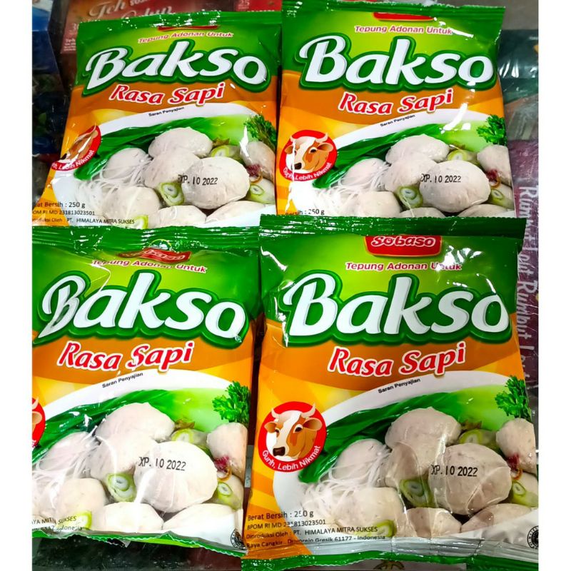 Tepung adonan bakso rasa sapi SOBASO merupakan tepung campuran yang digunakan untuk membuat citra rasa sapi lebih kental, dan nikmat. Tepung sobaso terbuat dari bahan pilihan, memiliki rasa yang lezat, berkualitas, harga terjangkau, serta sudah berlabel HALAL. Berat 250gr