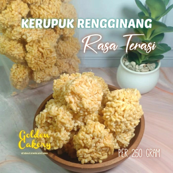Rengginang, cemilan khas pulau jawa yang terbuat dari beras yang sudah dimasak, lalu dibentuk bulat dan dikeringkan dengan cara dijemur di bawah panas matahari, lalu digoreng dalam minyak goreng panas. Rengginang ini sangat renyah dan gurih seperti kerupuk.