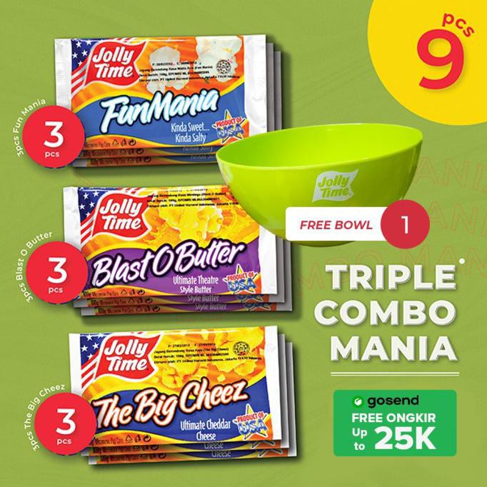 Deskripsi Paket Triple Mania Combo (3TBC,3BOB,3FM) - Jolly Time Mircowave Popcorn