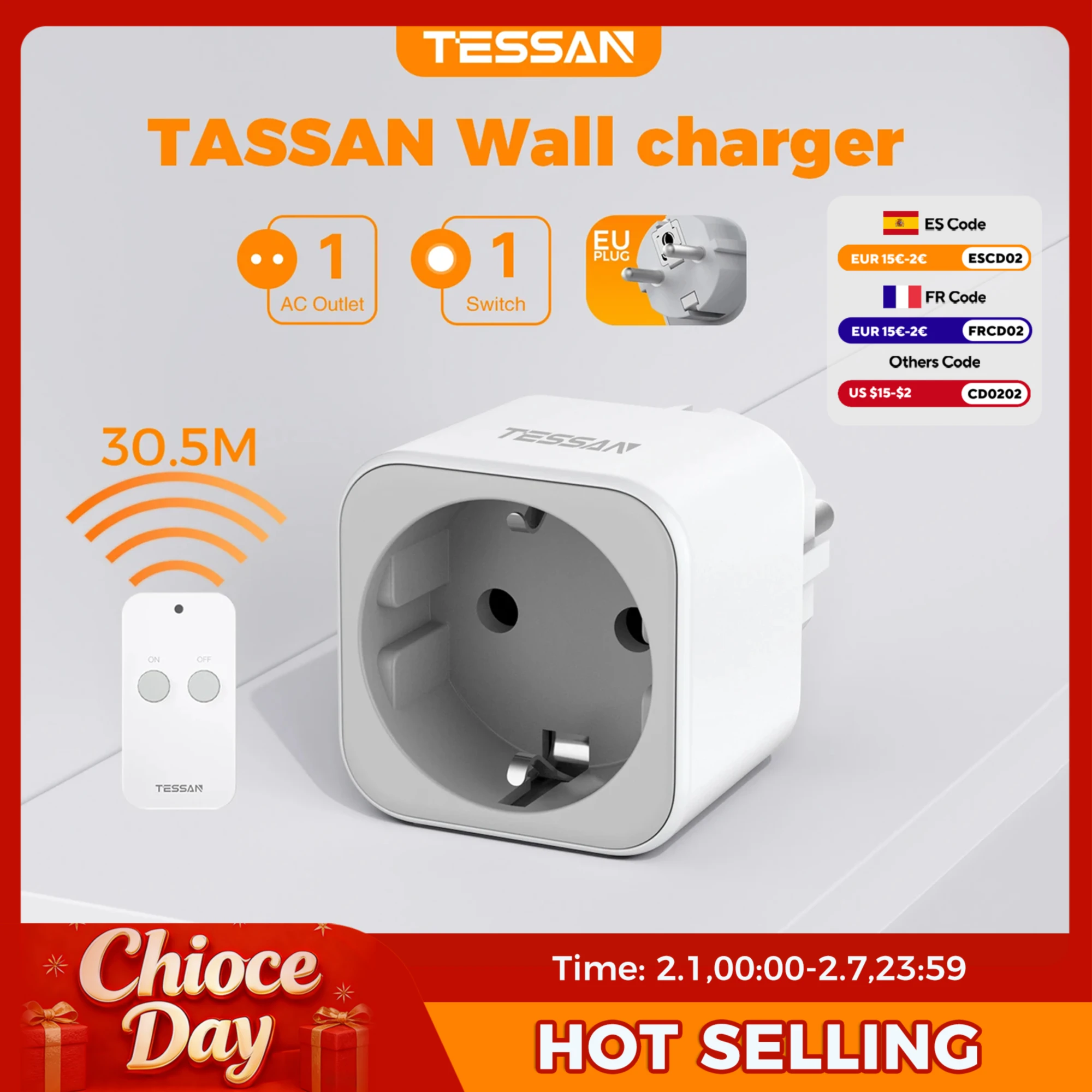 TESSAN 2300W Wireless Remote Controlled Plug Programmable Socket with Magnetic Remote Control EU Plug Adapter for Household