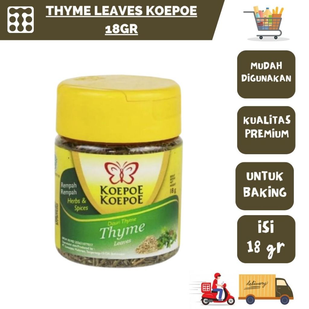 Terbuat dari daun Thyme pilihan dan bermutu untuk menambah cita rasa dan aroma pada masakan. Keunggulan (Unique Selling Point): 1. Diproduksi dari rempah rempah asli dan berkualitas sejak tahun 1942 2. Umur simpan yang lebih panjang karena sudah dikeringkan dari bahan asli dan diproses menjadi bubuk 3. Kualitas ekspor dan sudah diterima di berbagai negara dengan standar pangan yang ketat 4. Sertifikasi BPOM, HALAL, ISO 22000 dan HACCP 5. Memenuhi standar GMP 6. Kemasan yang praktis dalam penggunaan 7. Tanpa pengawet