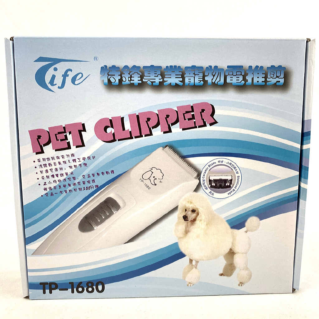 TIFE TP1680 Pet Clipper 800MAH 1 SpeedSpesifikasi :- 5 level ukuran potongan (dengan 4 ukuran sisir)- Baterai rechargeable- Quick Charging 1 jam- Waktu pemakaian 150 menit nonstop- Kapasitas baterai 800 mAH- Ukuran mata Clipper lebar 4 cm.