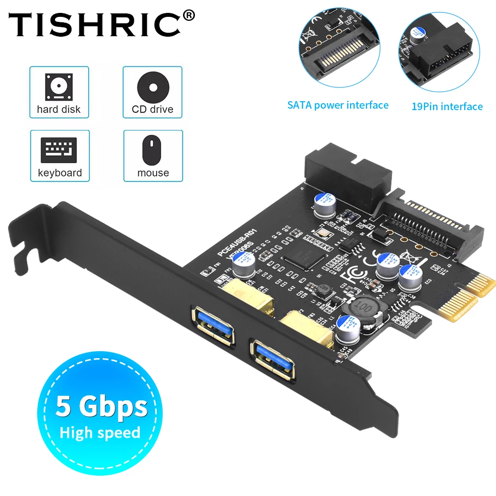 TISHRIC Лидер продаж USB 3.2 PCIE Карта расширения PCIE 1X к 2 порта USB 3.2 Genl 19-контактная карта расширения PCIE Контроллер PCI E 5 Гбит/с