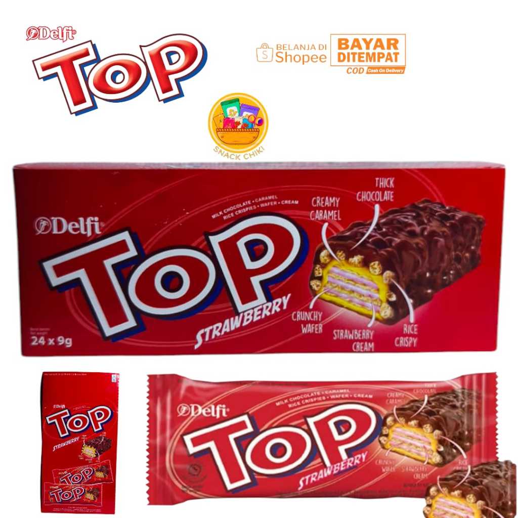 wafer top delfi dengan krim rasa strawberry creamy caramel,krispi beras dan cokelat sangan cocok buat cemilan sehari,,dan sangat mudah dibawah kemana mana.....sekali coba dijamin bikin tagih