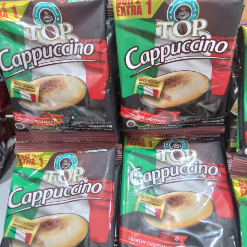 Top Coffee Cappuccino adalah kopi bubuk instant dengan rasa kopi asli yang ditambahkan dengan Crunchy Choco Malt dan Milky Foam yang lebih tebal persembahan dari Top Coffee.1renceng15pcs