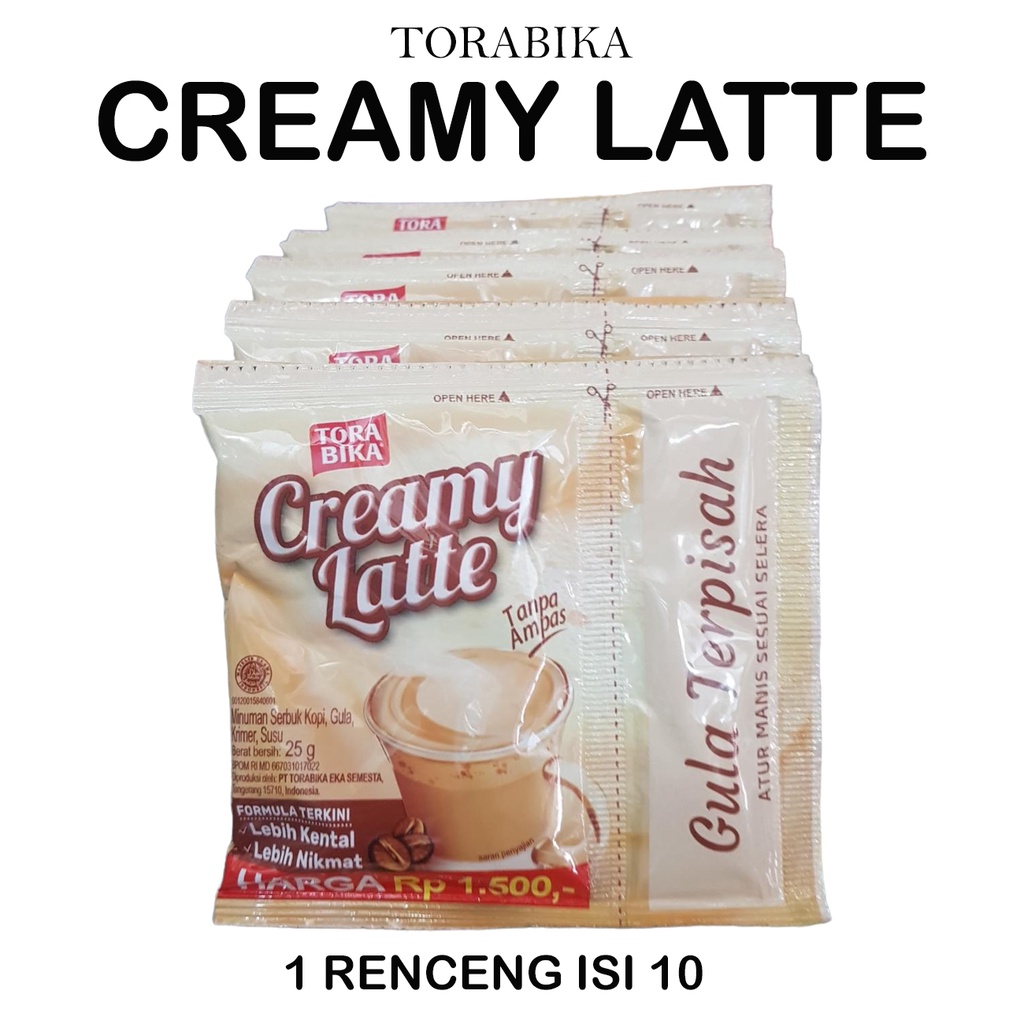 TORABIKA Creamy Latte Renceng Kopi instan super creamy dengan gula terpisah. Perpaduan antara campuran kopi instan yang wangi dengan creamer manis dan lezat yang memberikan keistimewaan untuk menikmati rasa kopi. Cita rasa kopi Latte yang super creamy dengan gula yang bisa diatur.