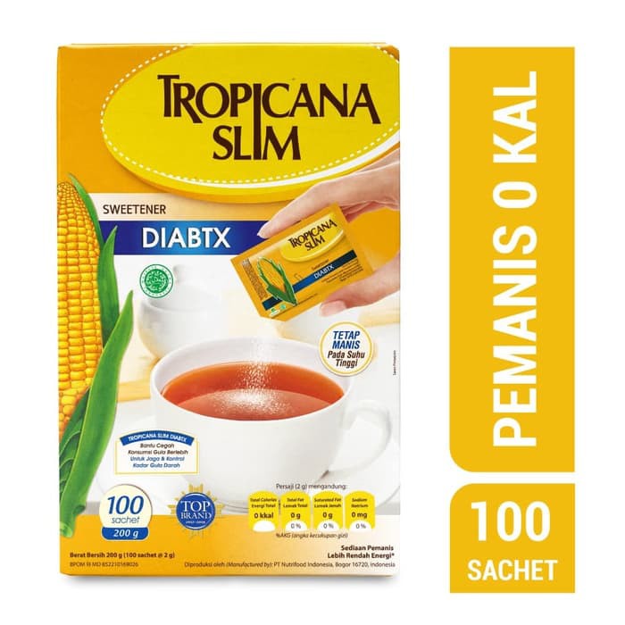 Tambahkan 1-2 sachet Tropicana Slim Sweetener DIABTX sebagai pengganti gula pasir, dalam minuman Anda. 1 sachet (2 gram) Tropicana Slim Diabtx setara dengan 2 sendok teh (10 gram) gula pasir.