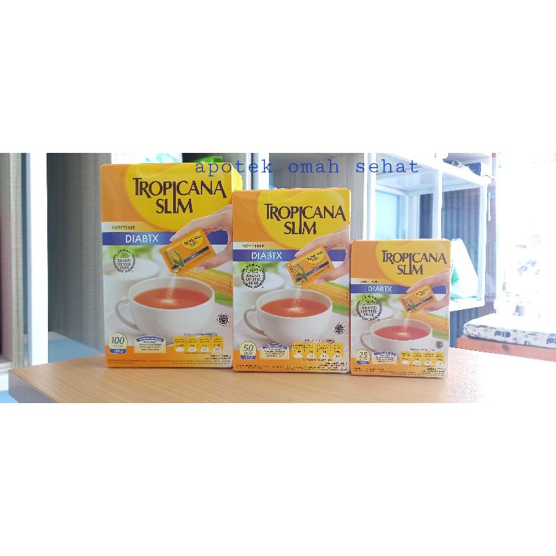 Cara Penyajian dan Petunjuk Konsumsi : Tambahkan 1-2 sachet Tropicana Slim Sweetener DIABTX sebagai pengganti gula pasir, dalam minuman Anda. 1 sachet (2.5 gram) Tropicana Slim Diabtx setara dengan 2 sendok teh (10 gram) gula pasir.
