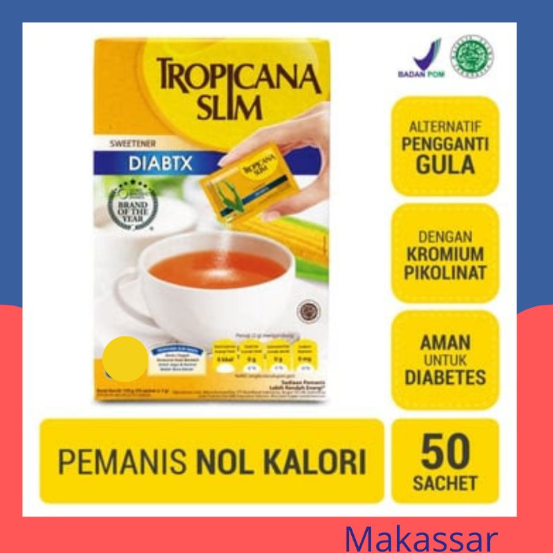 1 sachet (2 gram) Tropicana Slim Sweetener DIABTX setara dengan kemanisan 2 sendok teh (10 gram) gula pasir.