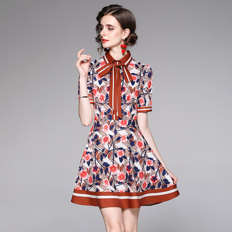 2021 Classic Shirt Neck A-Line Dress Runway Luxury Designer Women Short Sleeve Printed Office Ladies Slim Ribbon Bow Dresses Summer Autumn Vacation Party Mini Frock, 99