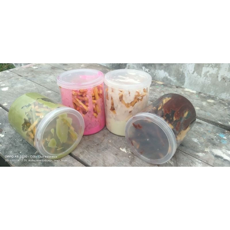talas Lumer adalah kripik stik talas yang disiram saus coklat/greentea/strawberry/vanilla
