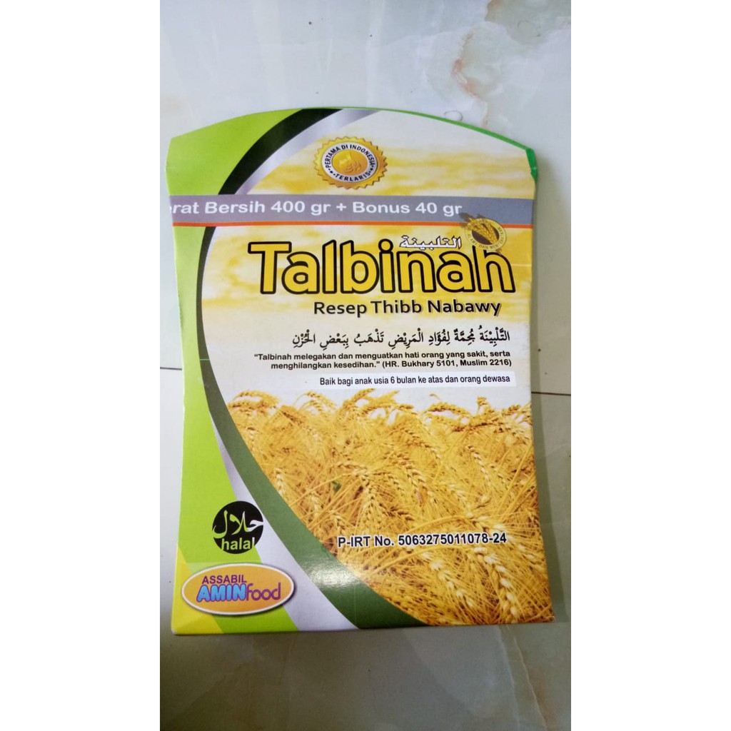 Talbinah adalah resep thibbun nabawy yang terbuat dari tepung hasil penggilinggan biji gandum murni alami. Membantu mengobati semua gangguan lambung, mengenyahkan sakit maag kronis secara herbal, alami dan nabawy. meluruhkan kolesterol dan mereduksi serangan jantung, mengurangi perut kembung dan masuk angin, antiemetic (mengurangi mual dan muntah), mengobati gastritis serta sebagai makanan tambahan untuk kesehatan lambung. (baik bagi anak usia 6 bulan ke atas)