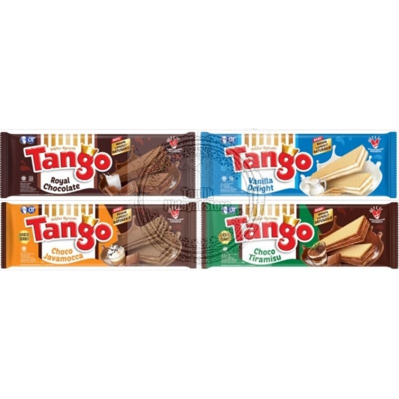 Tango wafer dengan perpaduan 2 rasa unik cokelat & kopi javamocca dan cokelat & tiramisu dalam 1 gigitan wafer.